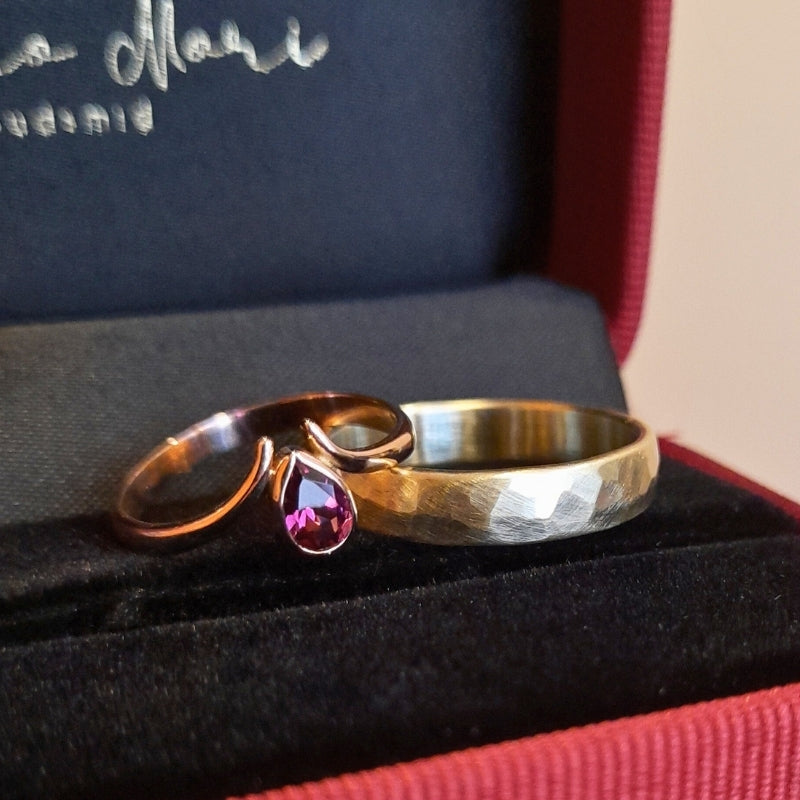 roodgouden trouwring met framboosgranaat en gehamerde herenring